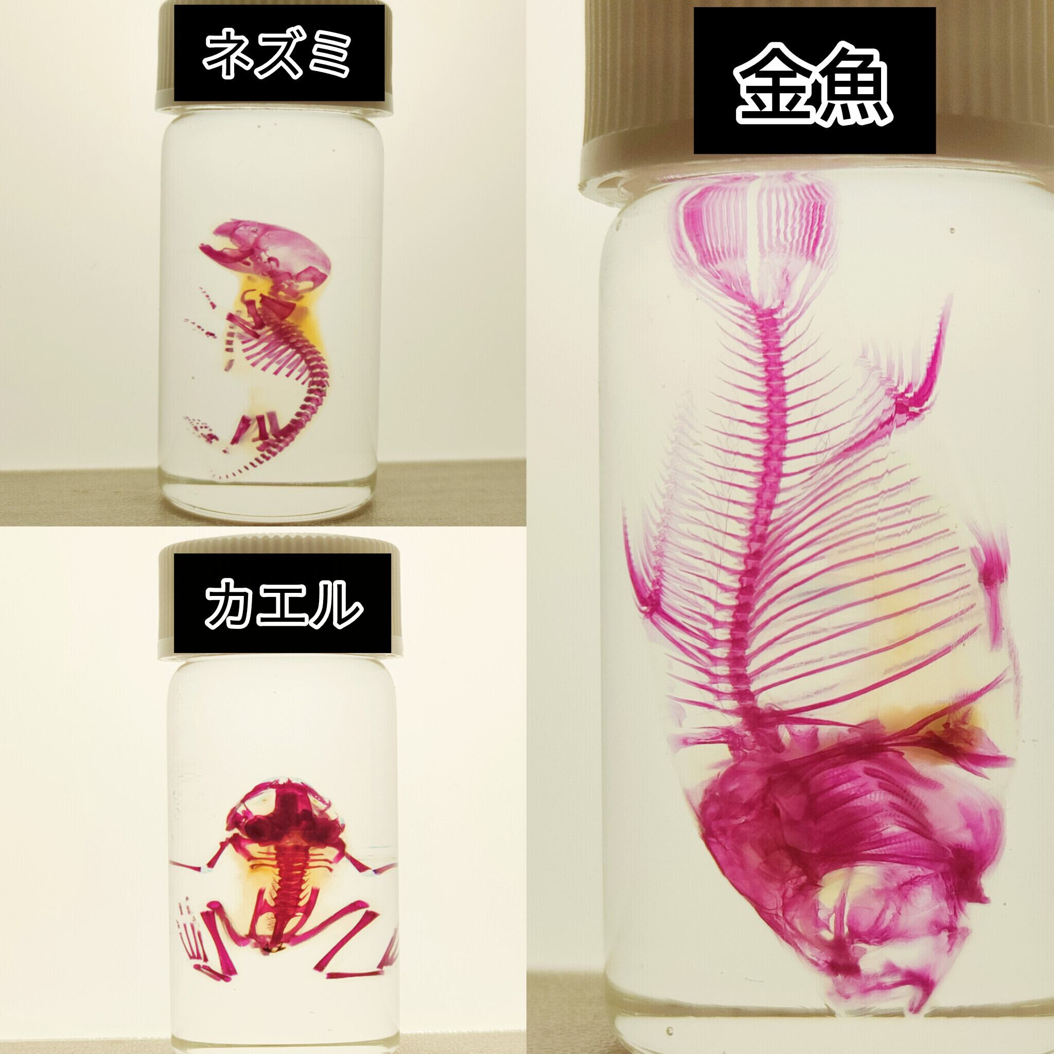 一般の方でも簡単に透明標本が作製できるように、オリジナルの作製方法と試薬を使ってキットにしました。当店の通常の【透明標本作製キット】よりお手軽に短期間でできるように、ホルマリン処理をした試料(生き物)が入っています。作製期間は10〜20日間程度で完成します。(環境温度により反応速度が変わるため日数に幅があります。)