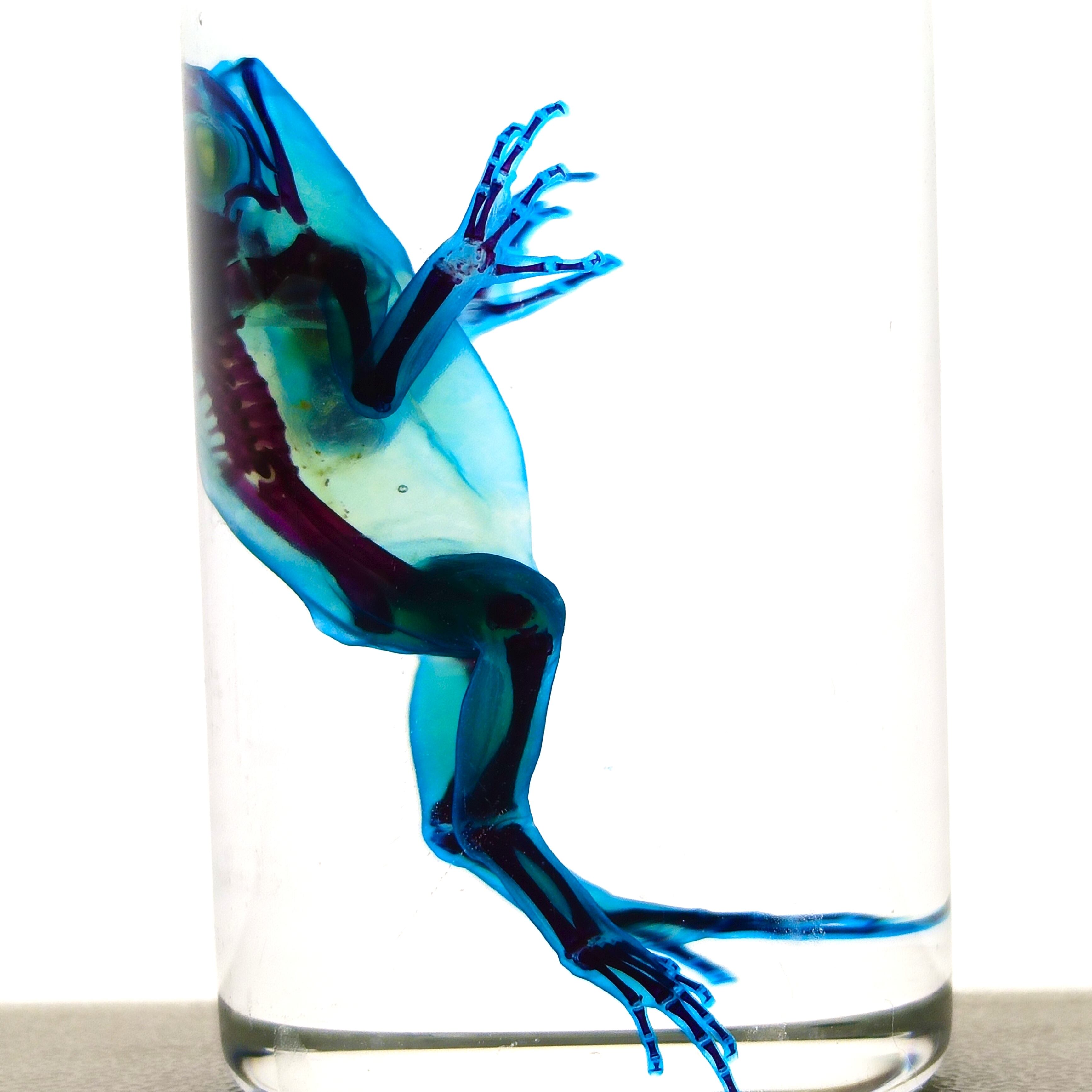 生物の硬骨を赤く、軟骨を青く染色し、タンパク質を透明にした標本で、生物を解体することなく立体的な骨格の配置を観察することができます。近年は見た目の美しさからインテリアとしても人気を博しています。