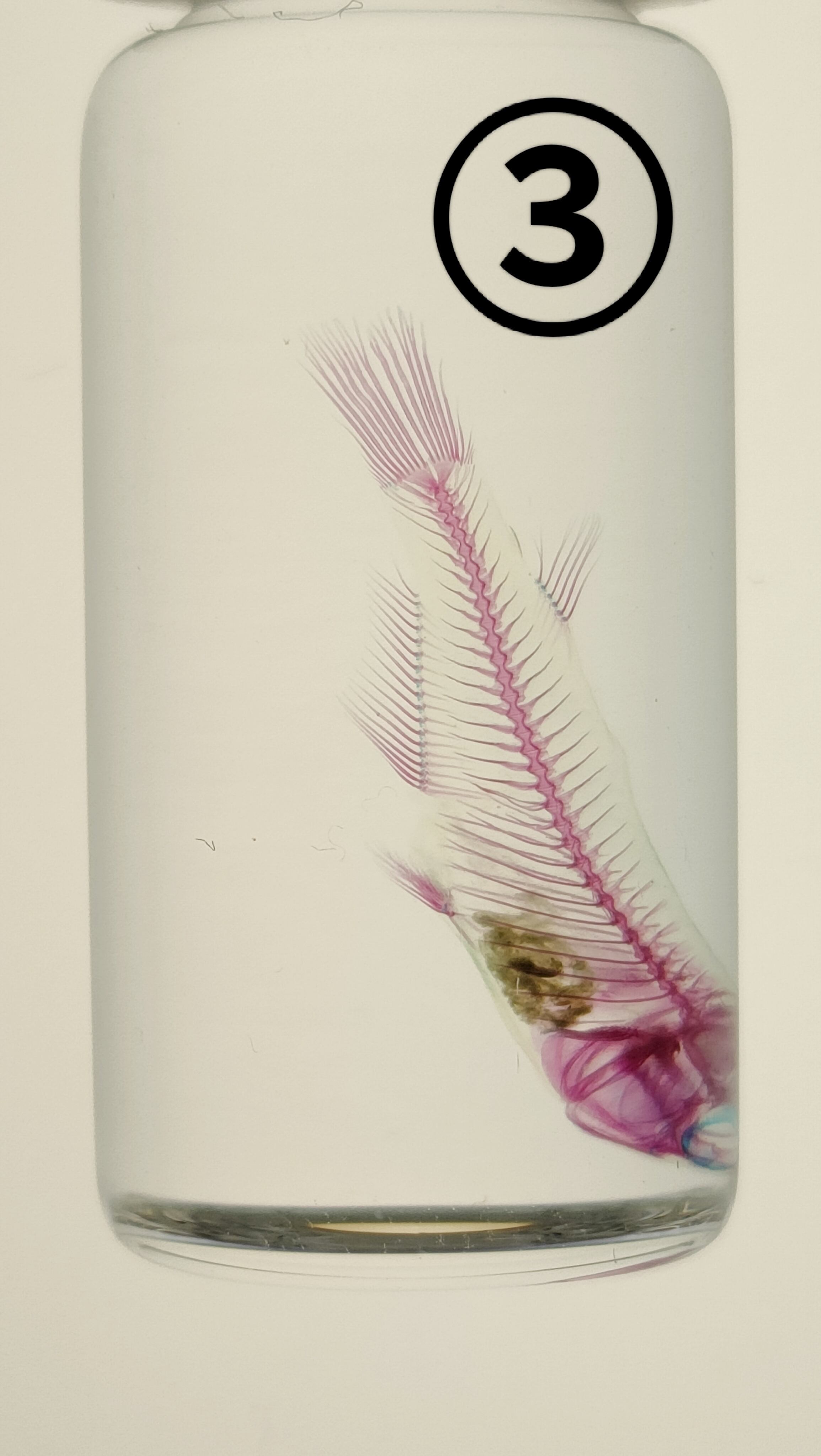 生物の硬骨を赤く、軟骨を青く染色し、タンパク質を透明にした標本で、生物を解体することなく立体的な骨格の配置を観察することができます。近年は見た目の美しさからインテリアとしても人気を博しています。